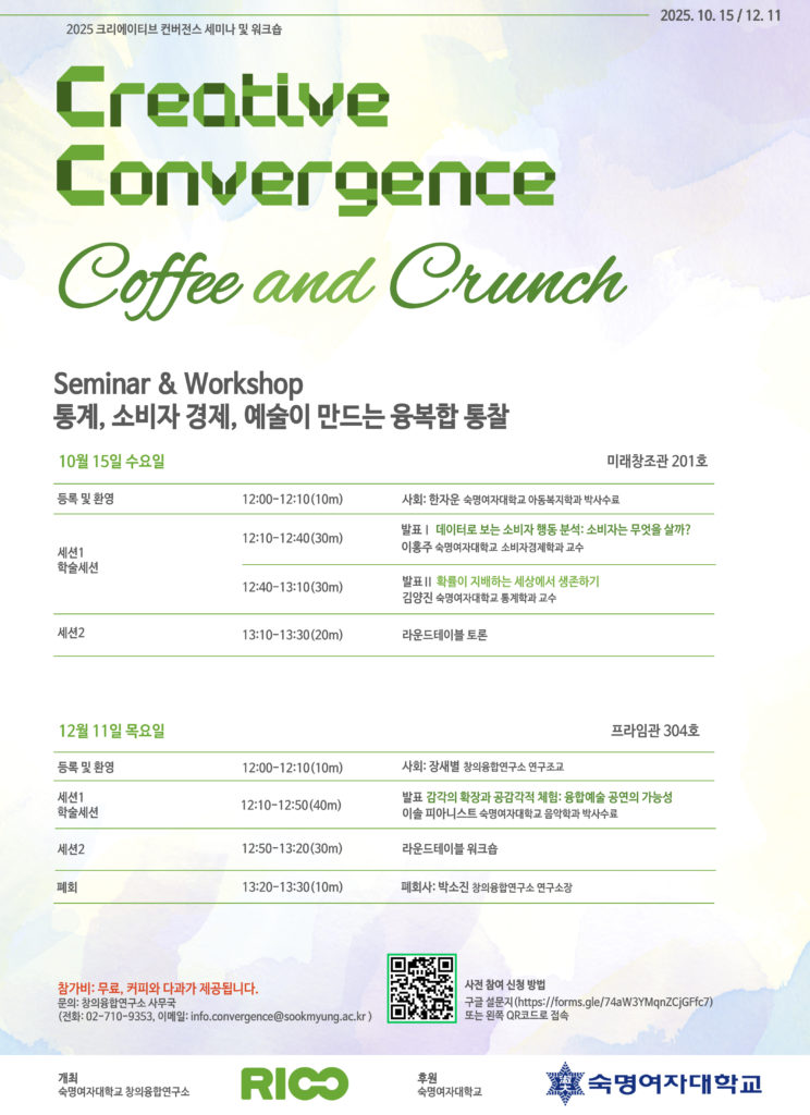 지난 10월 15일(수) 12시부터 13시 30분까지, 숙명여자대학교 미래창조관 201호에서 창의융합연구소 주관의 「Coffee & Crunch」 세미나가 성황리에 개최되었습니다. 이번 세미나는 점심 시간 동안 다과와 커피를 함께 나누며, 통계와 소비자 경제, 예술의 관점을 넘나드는 융복합적 통찰을 공유하는 자리로 마련되었습니다.